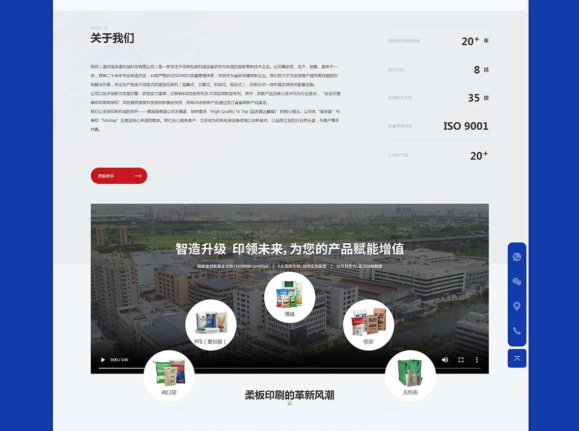 我司(温州海多堡机械科技有限公司)是一家专注于印刷包装机械设备研发与制造的国家高新技术企业。公司集研发、生产、销售、服务于一体,拥有二十余年专业制造历史,长期严格执行ISO9001质量管理体系,并获评为省级专精特新企业。我们致力于为全球客户提供高性能的印刷解决方案,专业生产各类不同型式的柔版印刷机(层叠式、卫星式、机组式、组合式)、印刷分切一体机等及其相关配套设备。