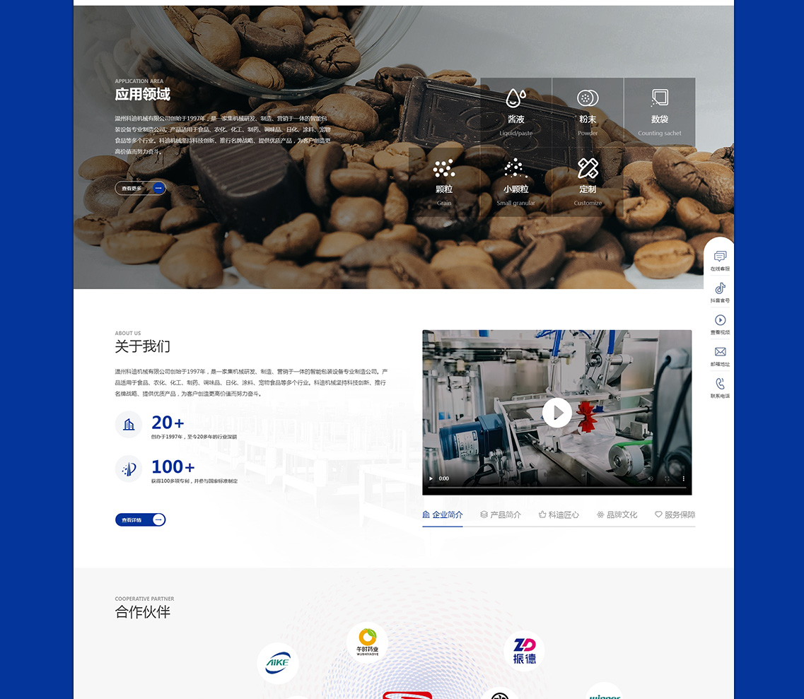 温州科迪机械有限公司创始于1997年,是一家集机械研发、制造、营销于一体的智能包装设备专业制造公司。产品适用于食品、农化、化工、制药、调味品、日化、涂料、宠物食品等多个行业。科迪机械坚持科技创新、推行名牌战略、提供优质产品,为客户创造更高价值而努力奋斗。经过二十多年的深耕,科迪机械已获得100多项专利,通过ISO9001:2015国际质量体系认证,并参与国家标准制定,是国家标准起草单位之一,且产品通过欧盟CE认证。凭着多年的努力,科迪机械陆续荣获:国家高新技术企业、多项国家火炬计划